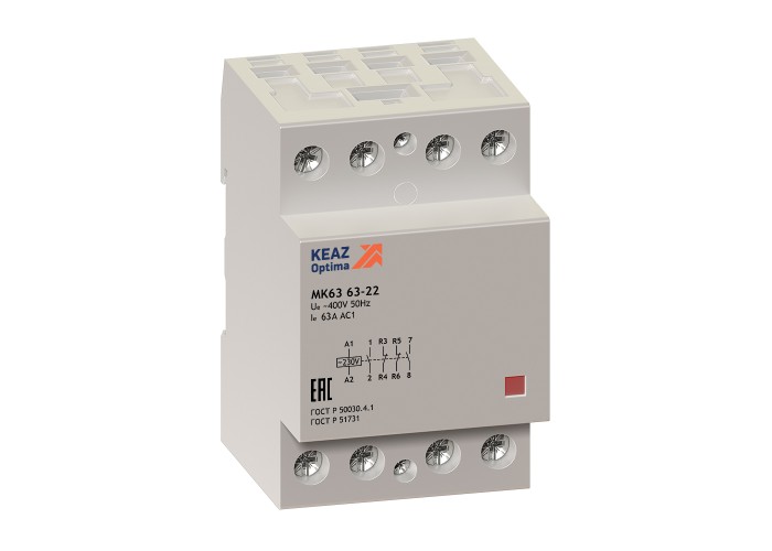 Модульный контактор на номинальный ток 63 А габаритом 3 модуля с 3 главными замыкающими контактами и 4 размыкающими.